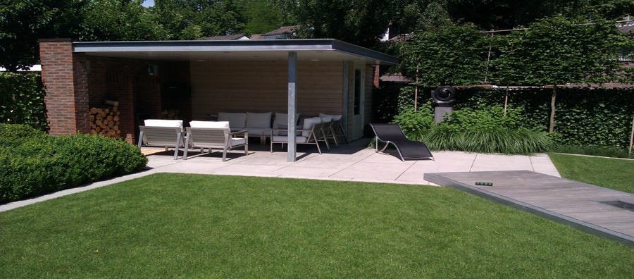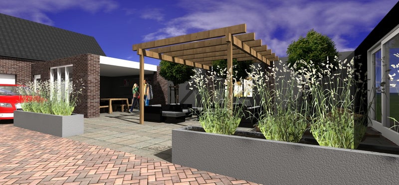 Sloop gedeelte van bijgebouwen en nieuw ontwerp voor ontstane tuin en buitenkeuken.